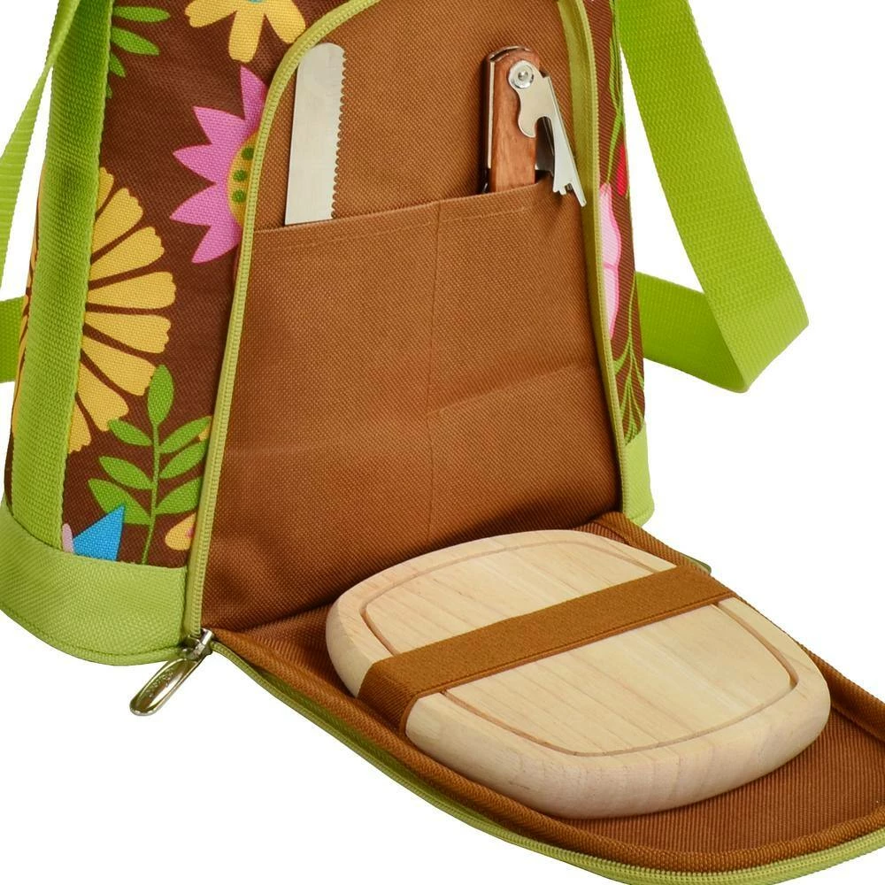 - Includes a hardwood cutting board with juice groove, stainless steel cheese knife and corkscrew in front pocket – adjustable should strap