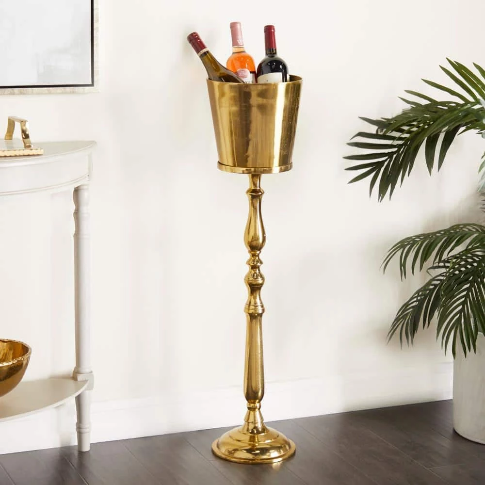 Entertain in style or use as a storage display to keep your bottled beverages cool and protected on any surface with this standing gold wine bucket. Looks stylish in your living room or kitchen as a way to display and serve your favorite wines. Showoff your bottle beverage collection in the most elegant way with this wine holder. This item comes shipped in one carton. The aluminum bucket is welded to its pedestal stand and polished with a glossy coating. Suitable for indoor use only. Made in India. Traditional Inspired.