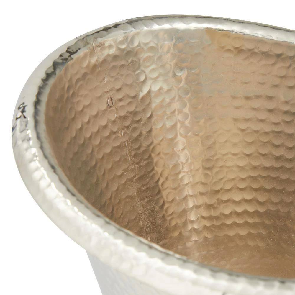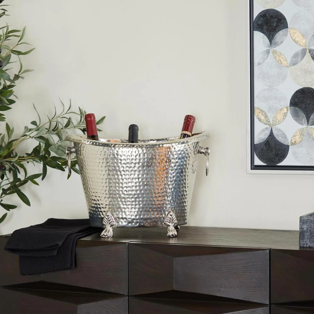 - Hammered aluminum piece featuring a bucket-inspired wine storage with deep structure, round side handles, and decorative feet with flourish details