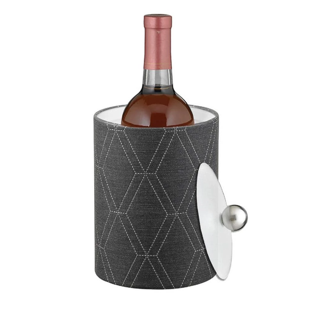 Kraftware Designer Vinyls show a new sophistication in color, texture, and style. Stonehenge has a texture resembling fabric with a distinctive geometric design, offered here in a dark gray. 2 qt. Stonehenge Midnight Tall Ice Bucket includes an acrylic lid with metal ball knob. Doubles as a bottle cooler.