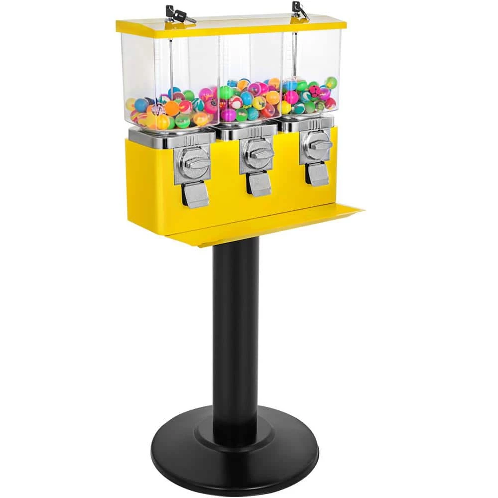 The VEVOR Candy Vending Machine DispenserSuperior a triple pod candy gumball machine available for 350 gumballs, bouncy balls or 1 in. round capsules, 8-10 lb. of candy for each tank. With the interchangeable pod system, it is quite quick and easy to refill. Suitable for both free standing and countertop usage.