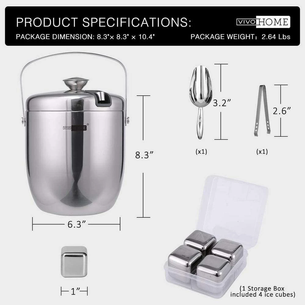 Treat yourself and your guests to ice-cold beverages with this convenient, well-crafted ice bucket from VIVOHOME. The package comes with a brushed stainless steel, double-insulated ice bucket that resists sweating, rust, and general wear-and-tear; a brushed stainless steel scoop; tongs; and four stainless steel multi-use ice cubes. Perfect for parties, restaurants, cafes, bars, hotels, outdoors, beach trips, or spending time by the pool.