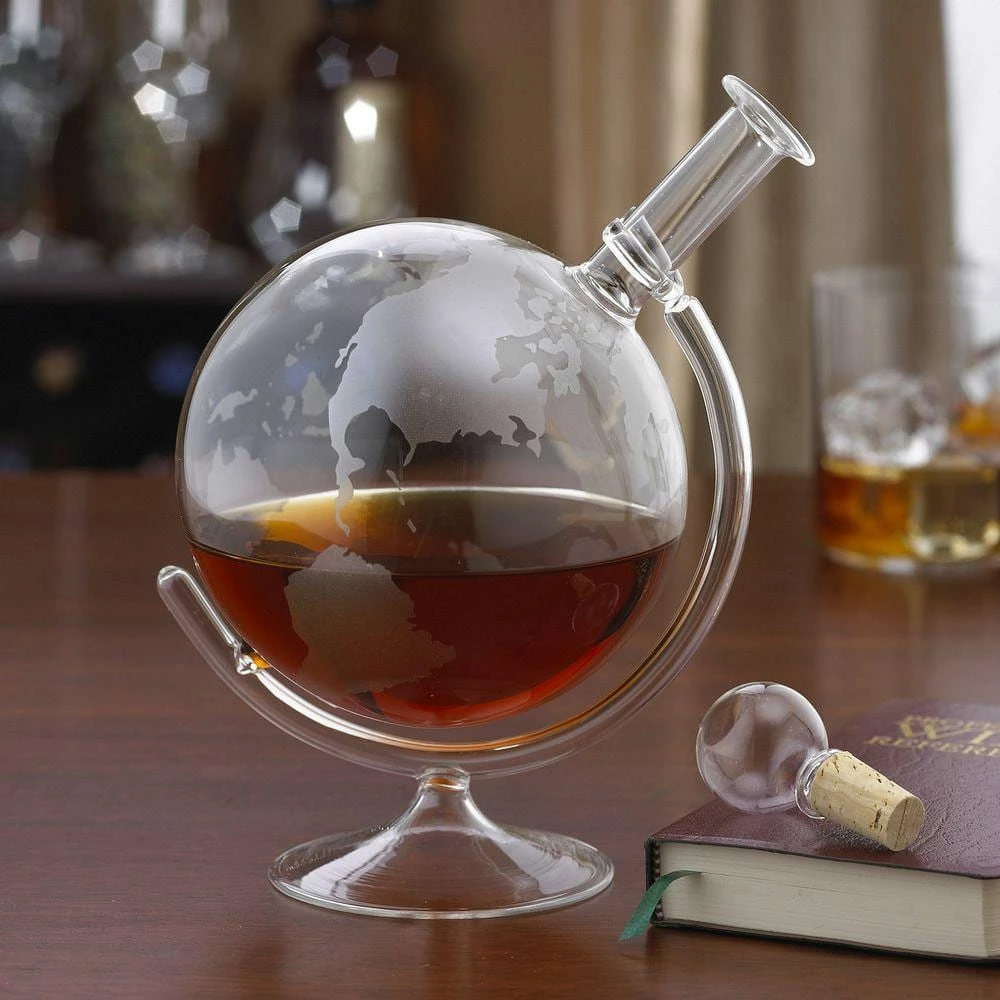Turn this globe spirits decanter east to west or west to east and admire the rich hue of your prized port, cognac or wine. As you spin the decanter, its precious contents will also aerate to open up the flavor and allow your wine or spirits’ aromas to develop. The heat-resistant glass globe decanter features decorative etching of the world map.