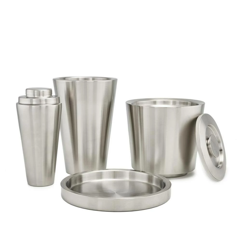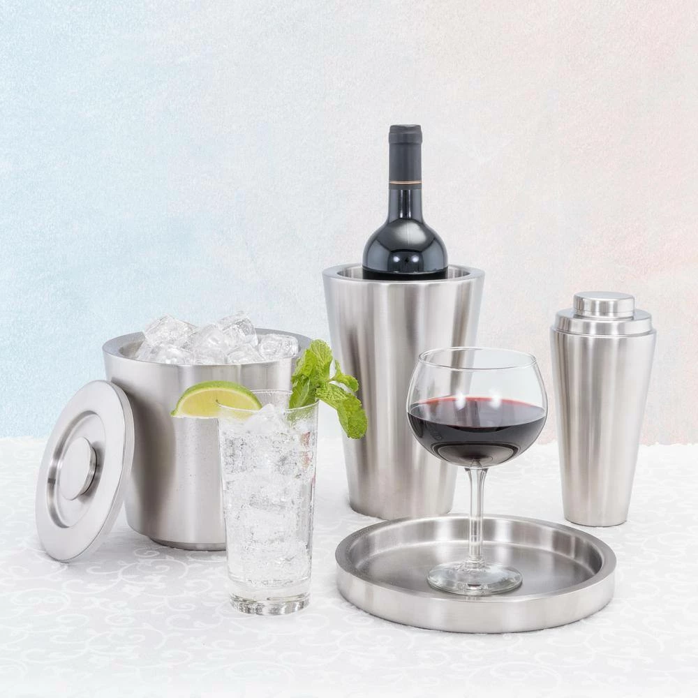 - Set includes 2 Qt. ice bucket, 25 oz. cocktail shaker, wine cooler, serving tray