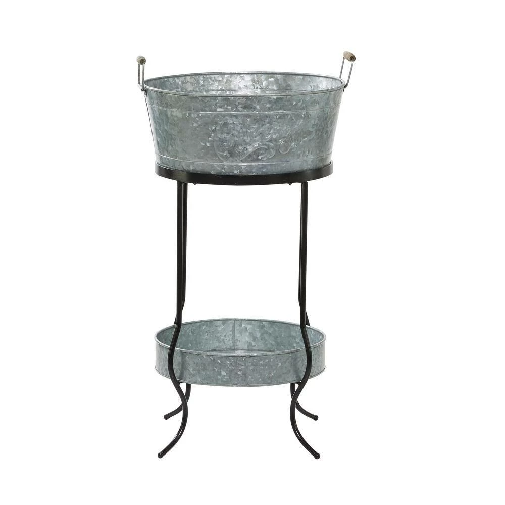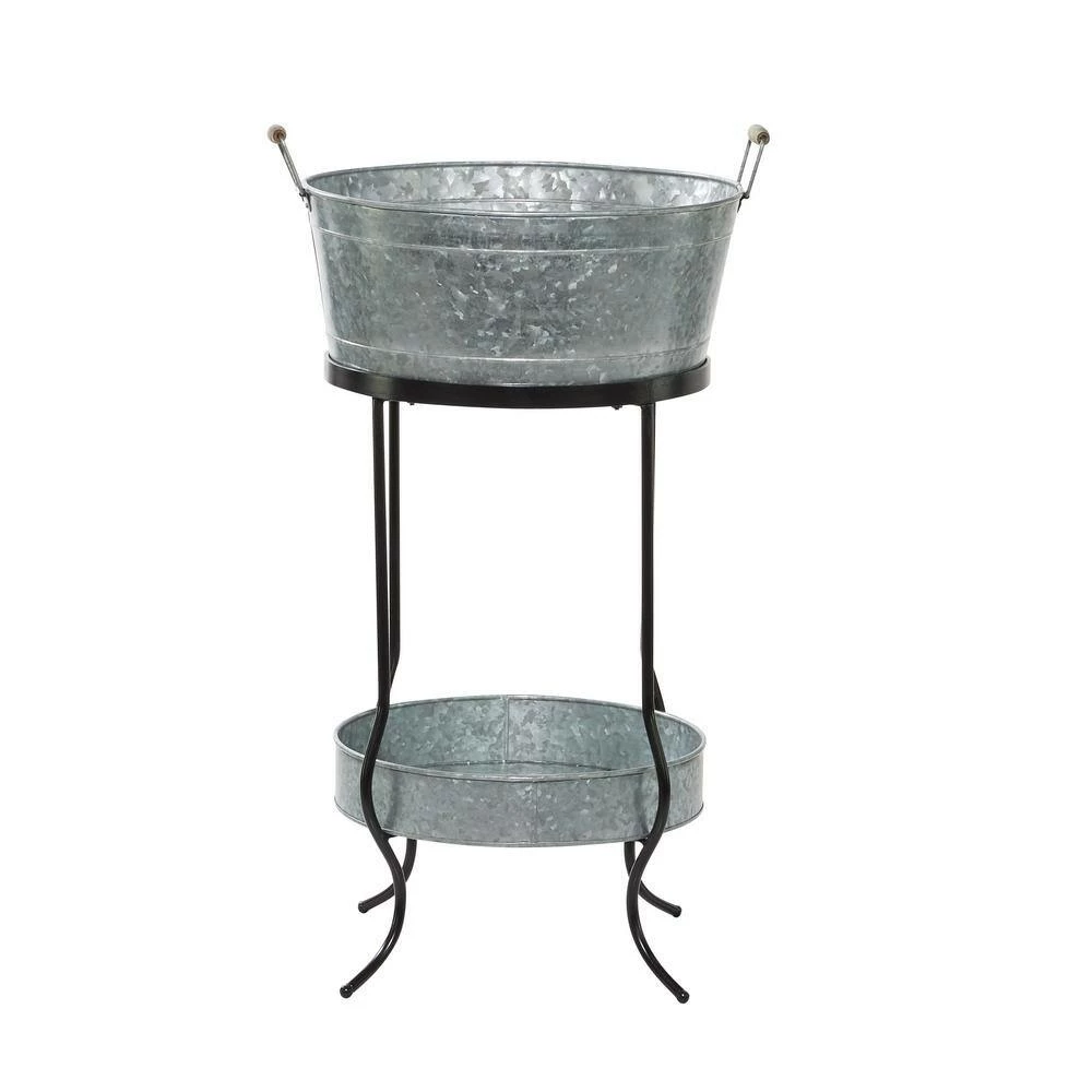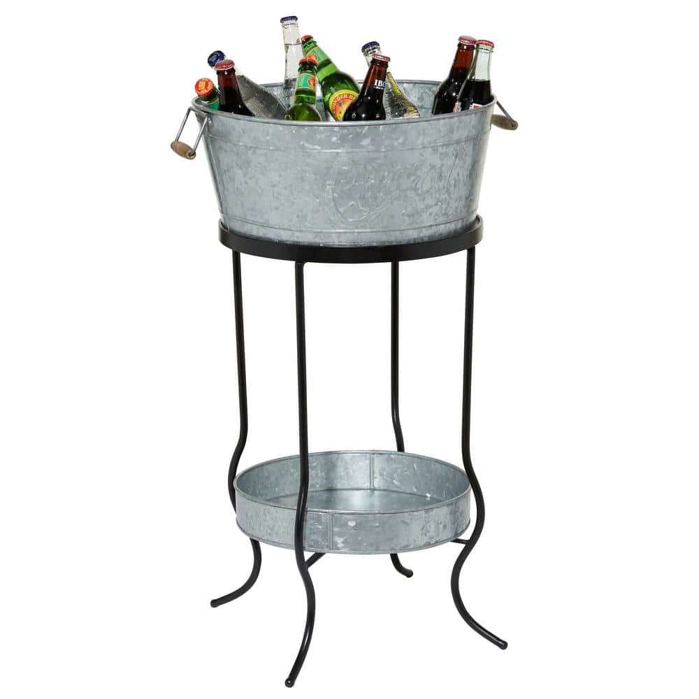 - Gray galvanized bucket cooler features a bottom tray held by curved leg stands