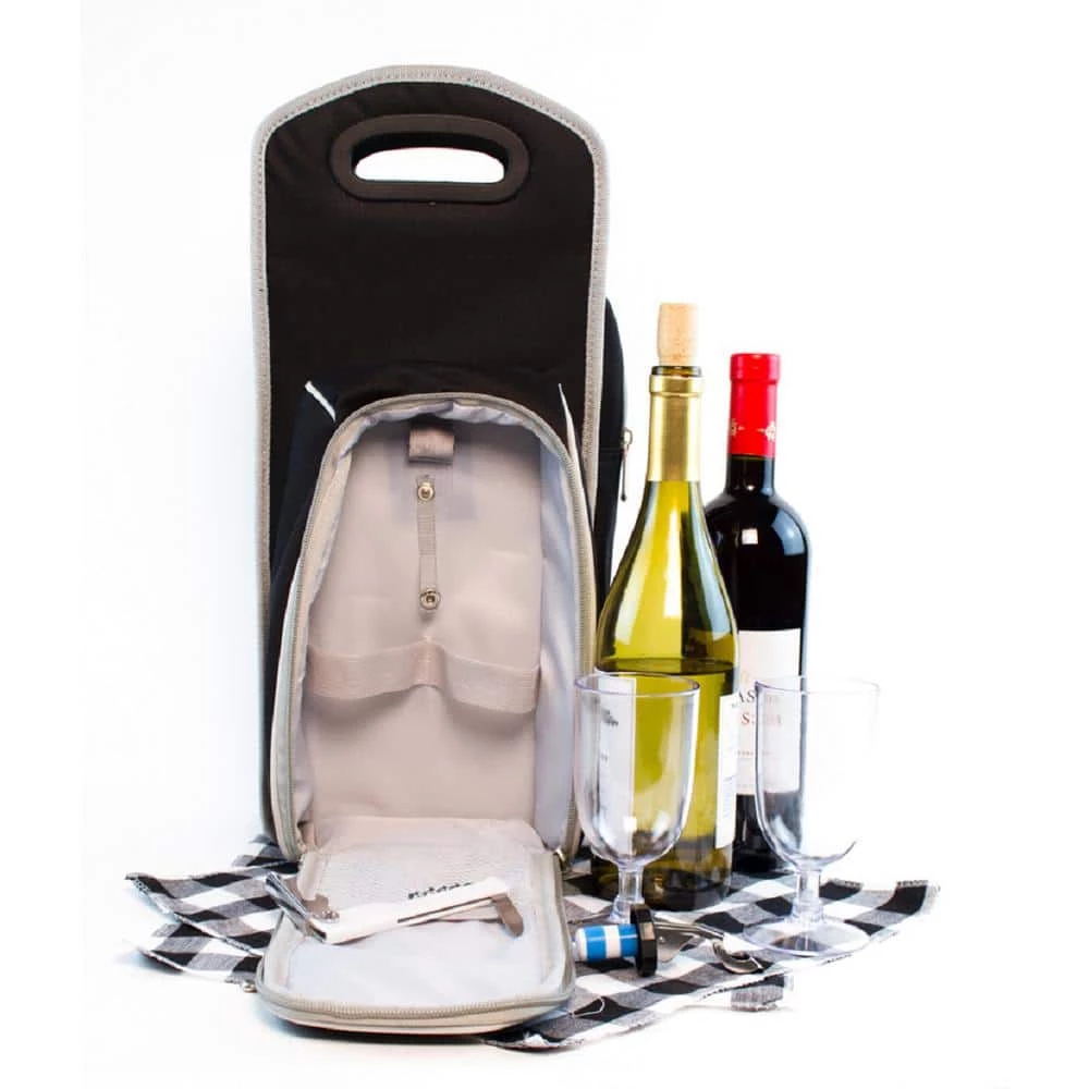 Multiple zippers and pockets for you to store most of your wine necessities with insulated compartment. Travel with you and enjoy fine winery everywhere you go. Picnic with your wine buddies or to the mountains and watch Sunset with your love. Comes with 2 plastic wine glasses securely inside the compartment. A bottle opener with plastic handle and a bottle stopper for your convenience. You will find two cute handkerchiefs inside. Handles for you to easily carry your wine tote bag.