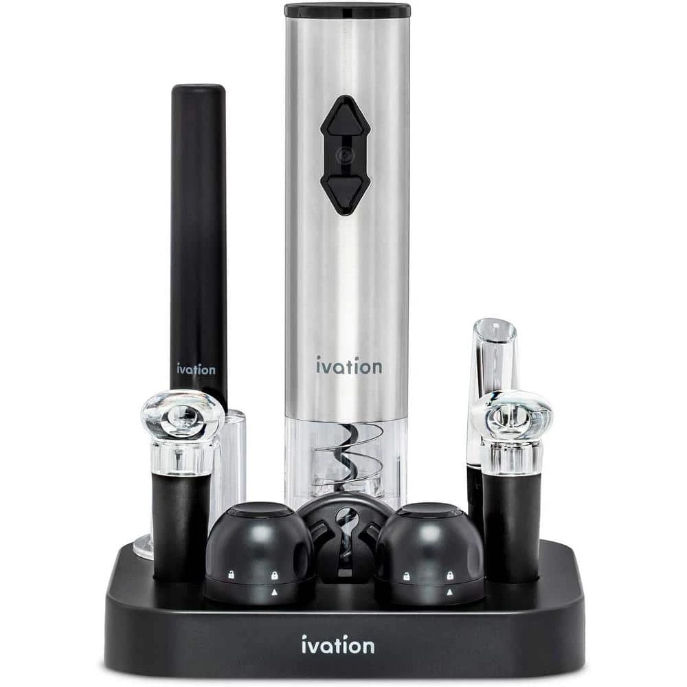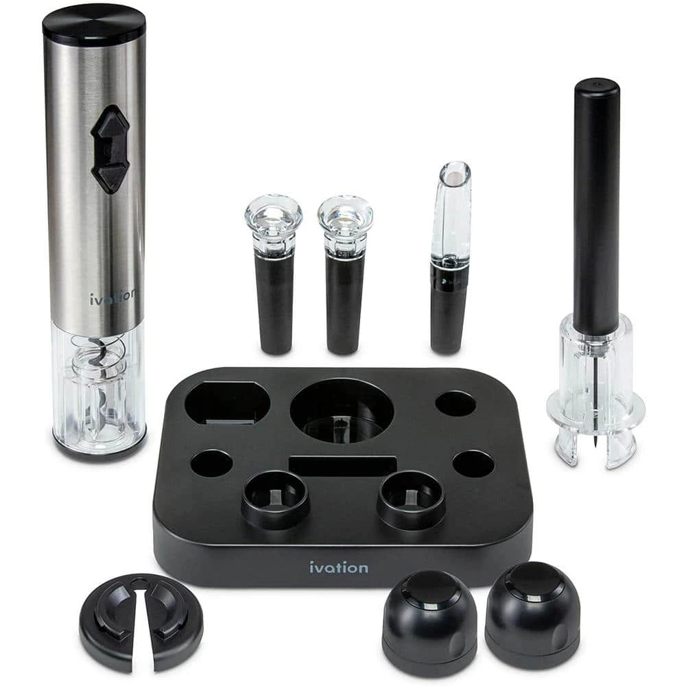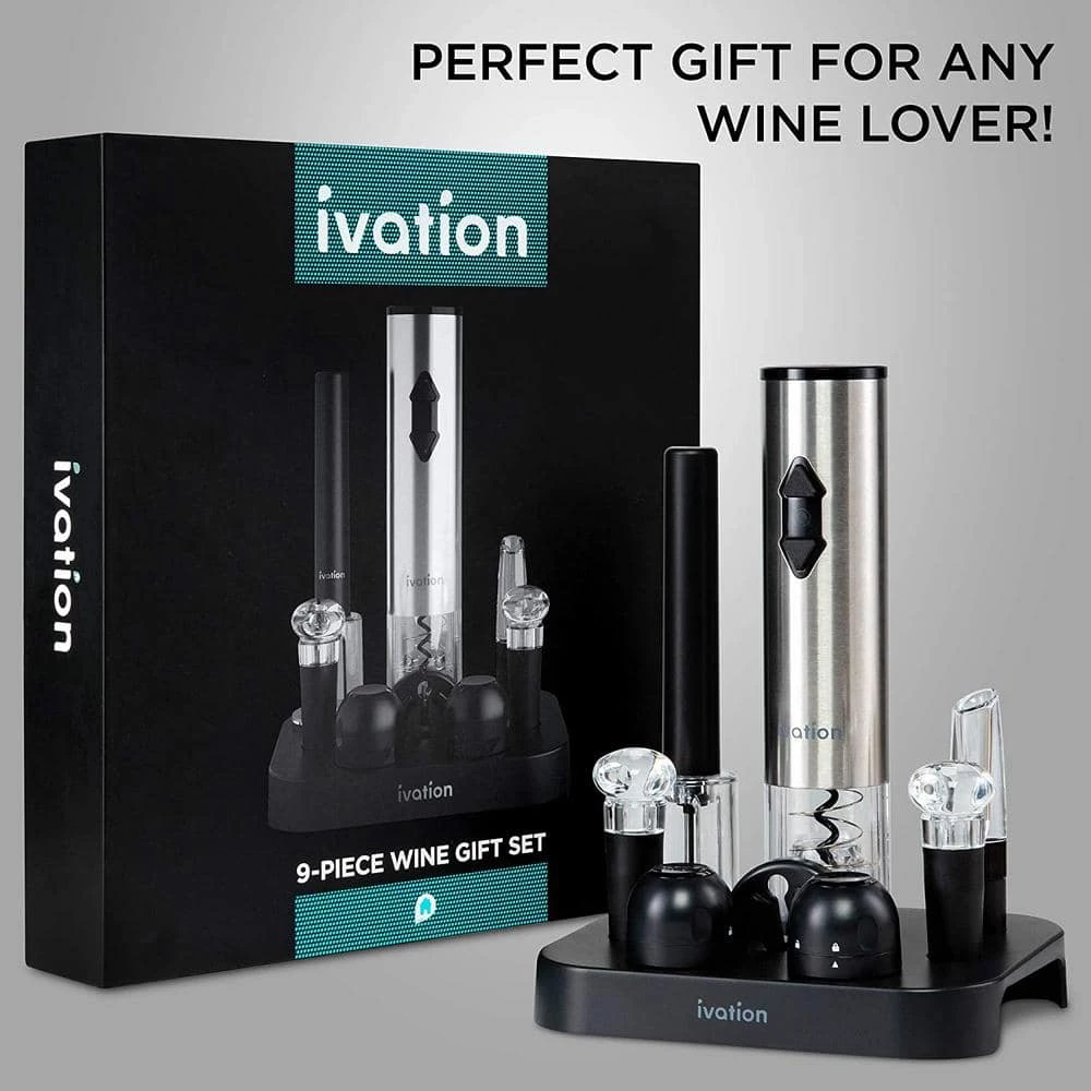Make anytime 5 o’clock If you are trying to relax and wind down, the Ivation 9-Piece Wine Gift Set is the perfect present for you. This worthwhile kit is great for weddings, holidays, parties, and social gatherings. This perfectly-packaged set comes with everything you need to loosen up and unwind. From openers to stoppers, this is a great gift set for any wine lover. The Ivation 9-Piece Wine Gift Set has a beautiful, elegant design that will add style and sophistication to your wine cabinet. Every piece is stationed beautifully in a sleek, smooth stand. Open your wine bottles quickly and easily with the air pump or battery-operated wine opener. Once opened, give your wine a chance to breath with the aerator. Store your bottles with a wine or champagne stopper. Celebrate the night with the perfect set to pop open a bottle. Easy to use – Each piece of this set is simple to operate and enhances your wine drinking experience Open any bottle – Includes a manual and automatic wine opener to make bottle opening simple Let your wine breath – Mount the aerator onto your wine bottles to enhance flavor and aroma Cut through the foil – Remove foil in seconds with the included cutter for easy foil removal Preserve your wine – Wine stoppers keep the freshness in and increase the lifespan of your wine