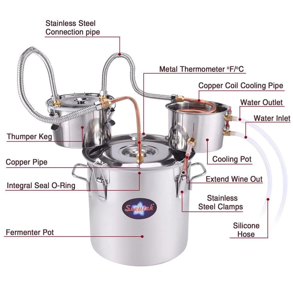 - Quality assurance–free returns, free parts replacement the liquor still kit included: fermentation barrel, condensing barrel, 1-way valve, thermometer, silicone hose, sealing kit, user manual fermentation pot: 13.8 in. x 15.8 in., condensation pot: 7.8 in. x 5.1 in. if you have any question during use, please contact the customer service at any time