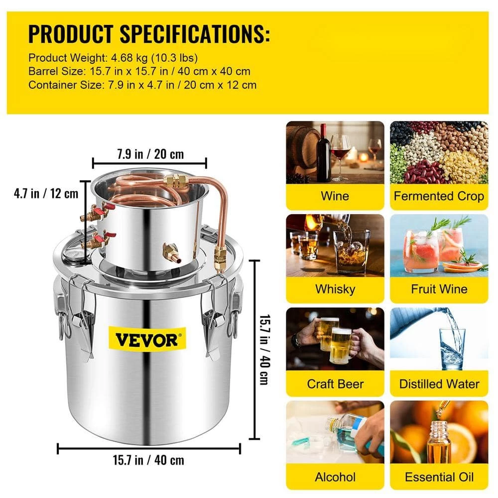 The VEVOR 13.2 Gal. Moonshine Water Distiller. A full set of moonlight distiller, suitable for beginners and experts, with excellent cooling performance. It can be used to distill fruit wine, water, brandy and essential oils, apply for various heating methods like gas stoves, firewood, and electric ceramic heaters.