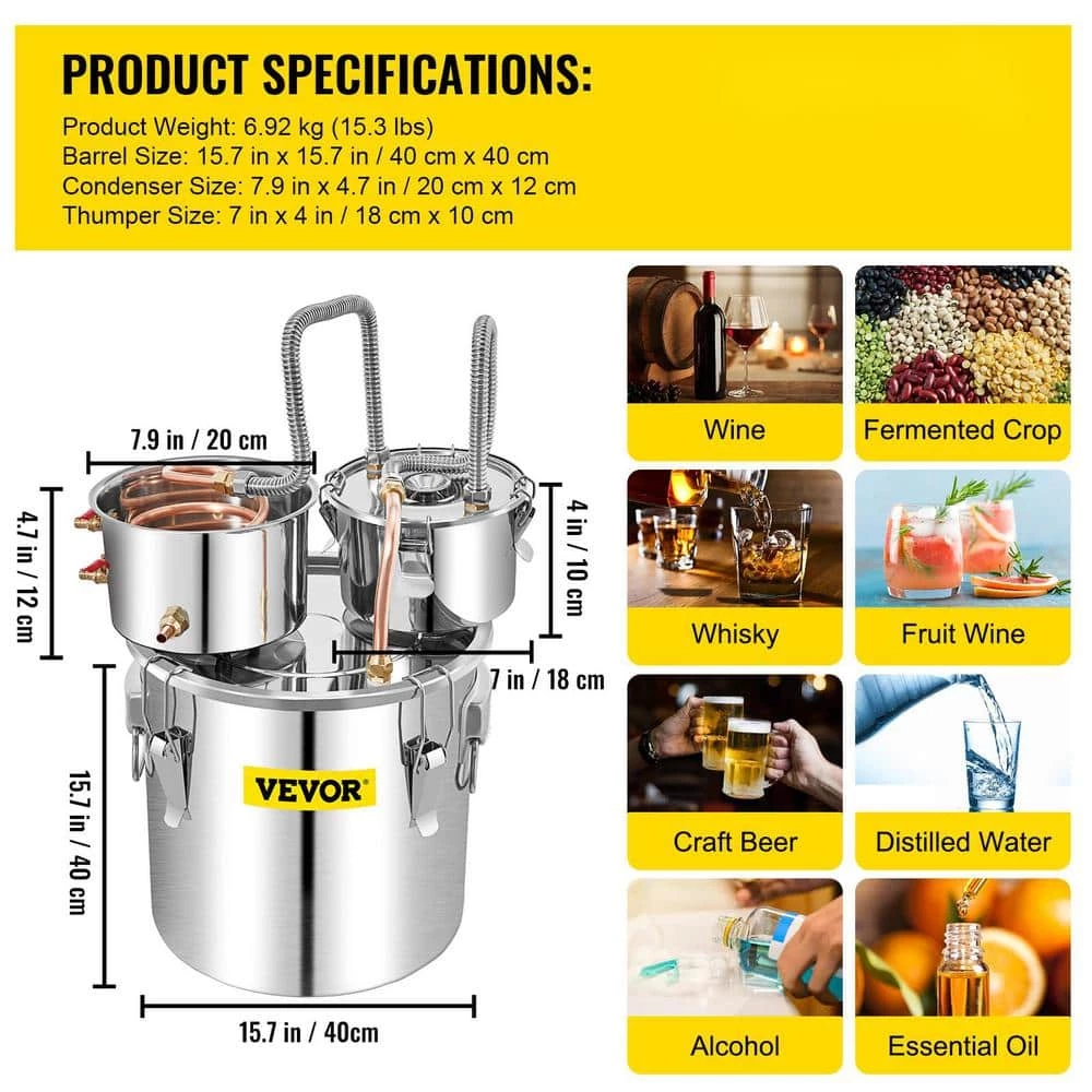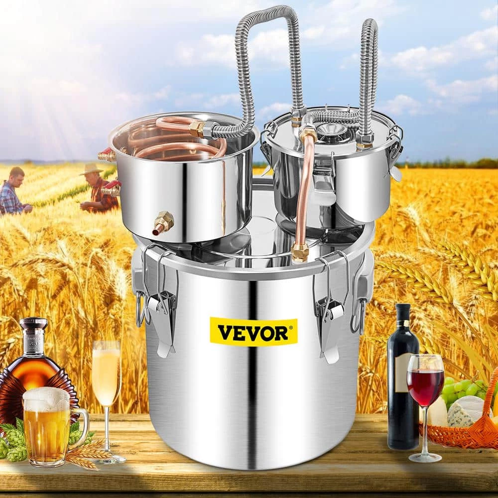 The VEVOR 13.2 Gal Alcohol Water Distiller. A full set of alcohol distiller, suitable for beginners and experts, with excellent cooling performance. It can be used to distill fruit wine, water, brandy and essential oils, apply for various heating methods like gas stoves, firewood and electric ceramic heaters.