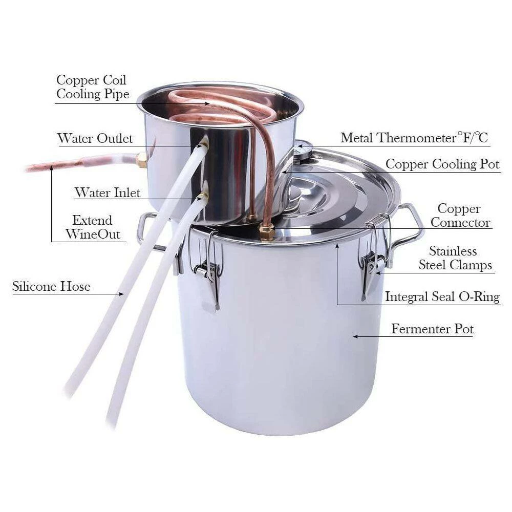 - Quality assurance–free returns, free parts replacement the liquor still kit included: fermentation barrel, condensing barrel, 1-way valve, thermometer, silicone hose, sealing kit, user manual fermentation pot: 13.8 in. x 13.8 in., condensation pot: 7.9 in. x 5.1 in. if you have any question during use, please contact the customer service at any time