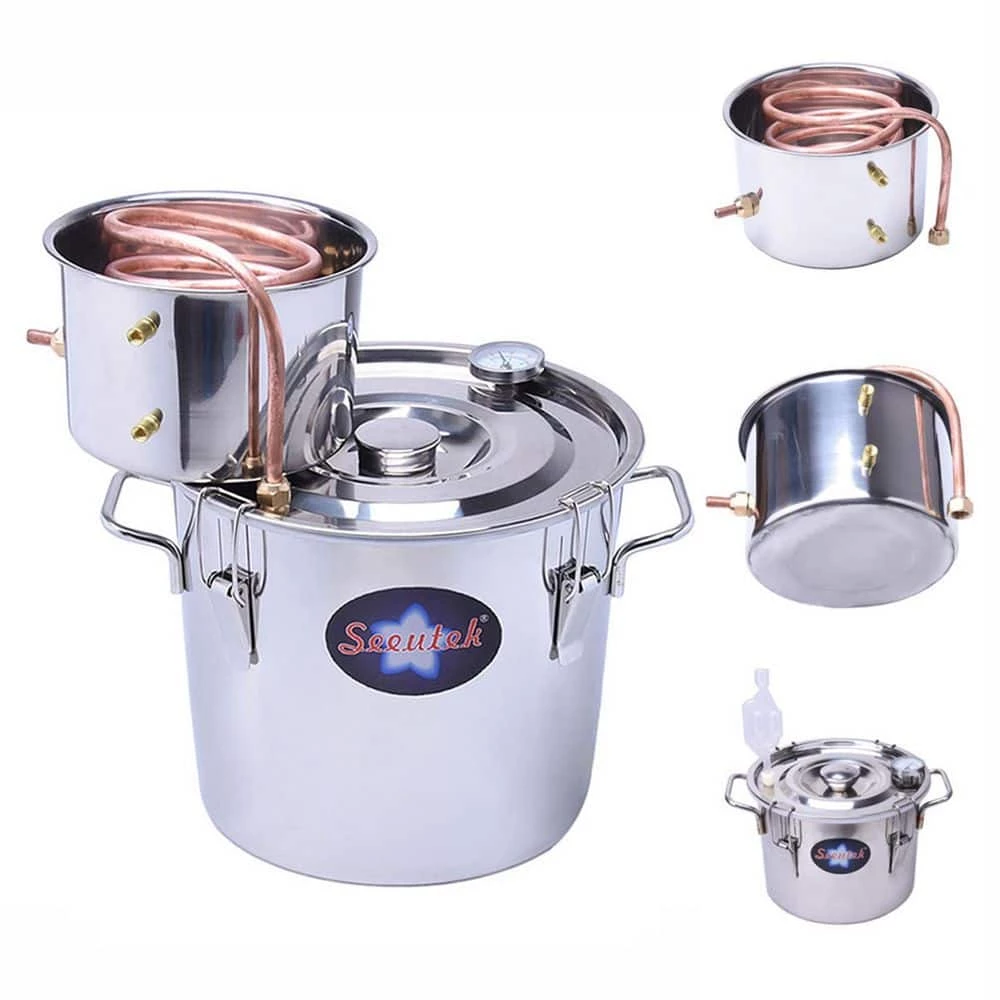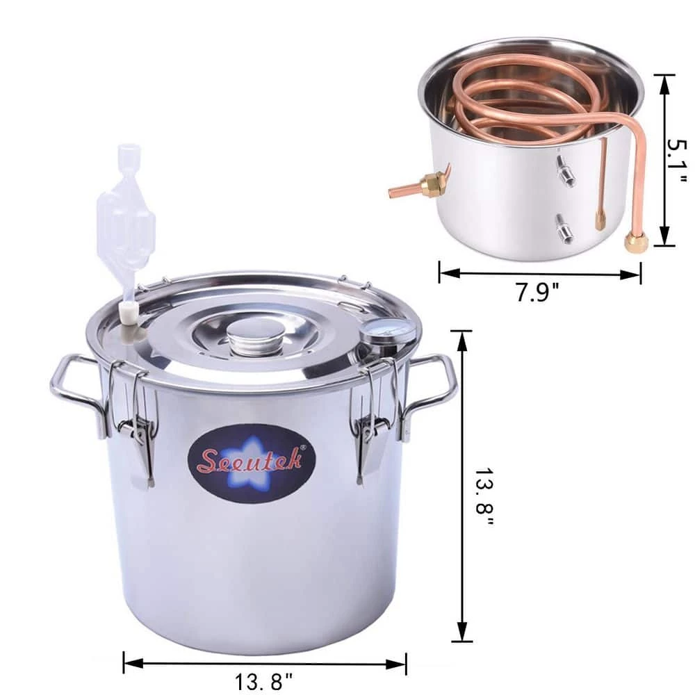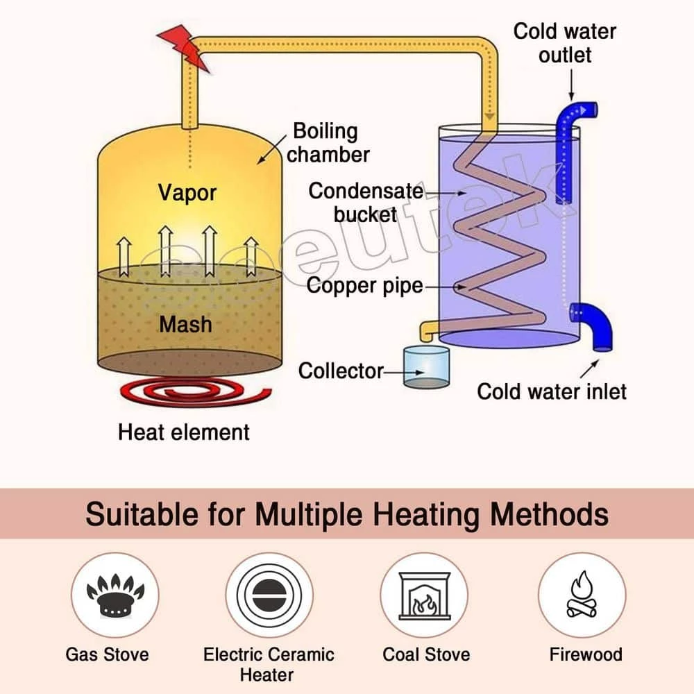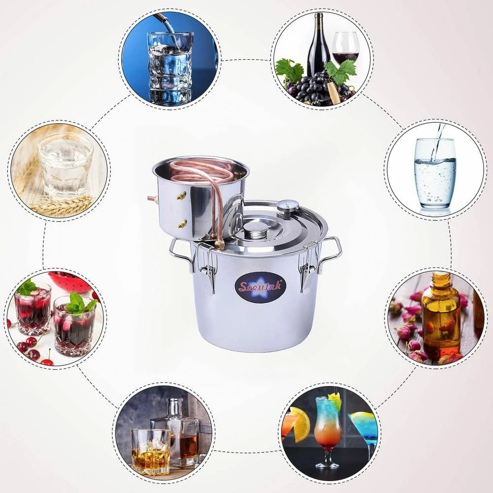 SEEUTEK Professional Alcohol Still Distillation–Home whiskey distiller, suitable for beginners or professional, easy to use. The home distiller adopts an open cooling method. The copper cooling tube has good thermal conductivity and has a larger contact area with the coolant. This makes the distilling equipment have excellent cooling performance and increase the wine production speed.