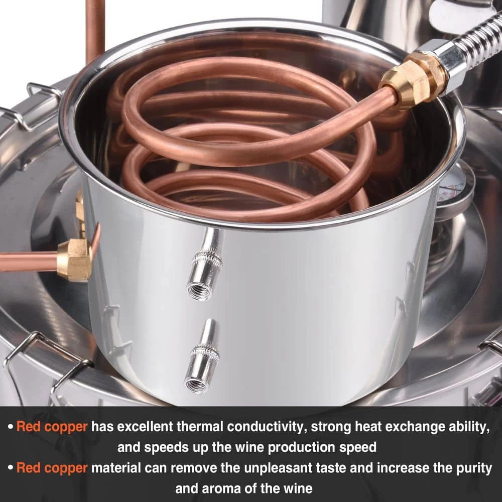 - Professional alcohol still–home copper still, suitable for beginners or professional, easy to use the alcohol kit adopts an open cooling method the copper cooling tube has good thermal conductivity and has a larger contact area with the coolant this makes the whiskey still have excellent cooling performance and increase the wine production speed