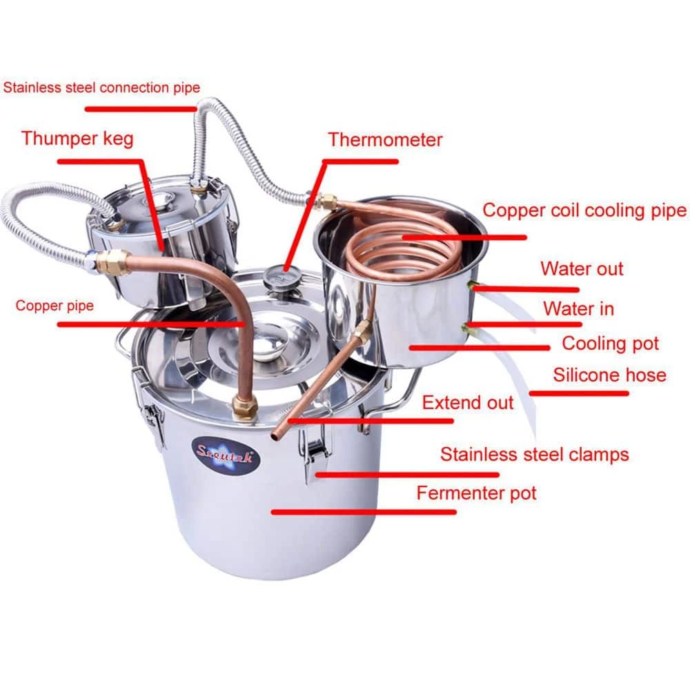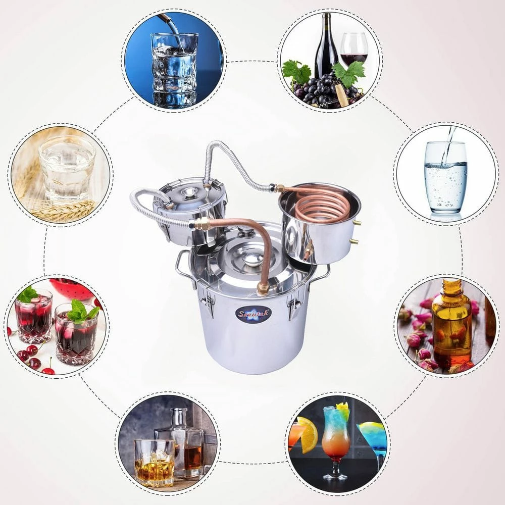 SEEUTEK Professional Alcohol Still Distillation–Home whiskey distiller, suitable for beginners or professional, easy to use. The home distiller adopts an open cooling method. The copper cooling tube has good thermal conductivity and has a larger contact area with the coolant. This makes the distilling equipment have excellent cooling performance and increase the wine production speed.