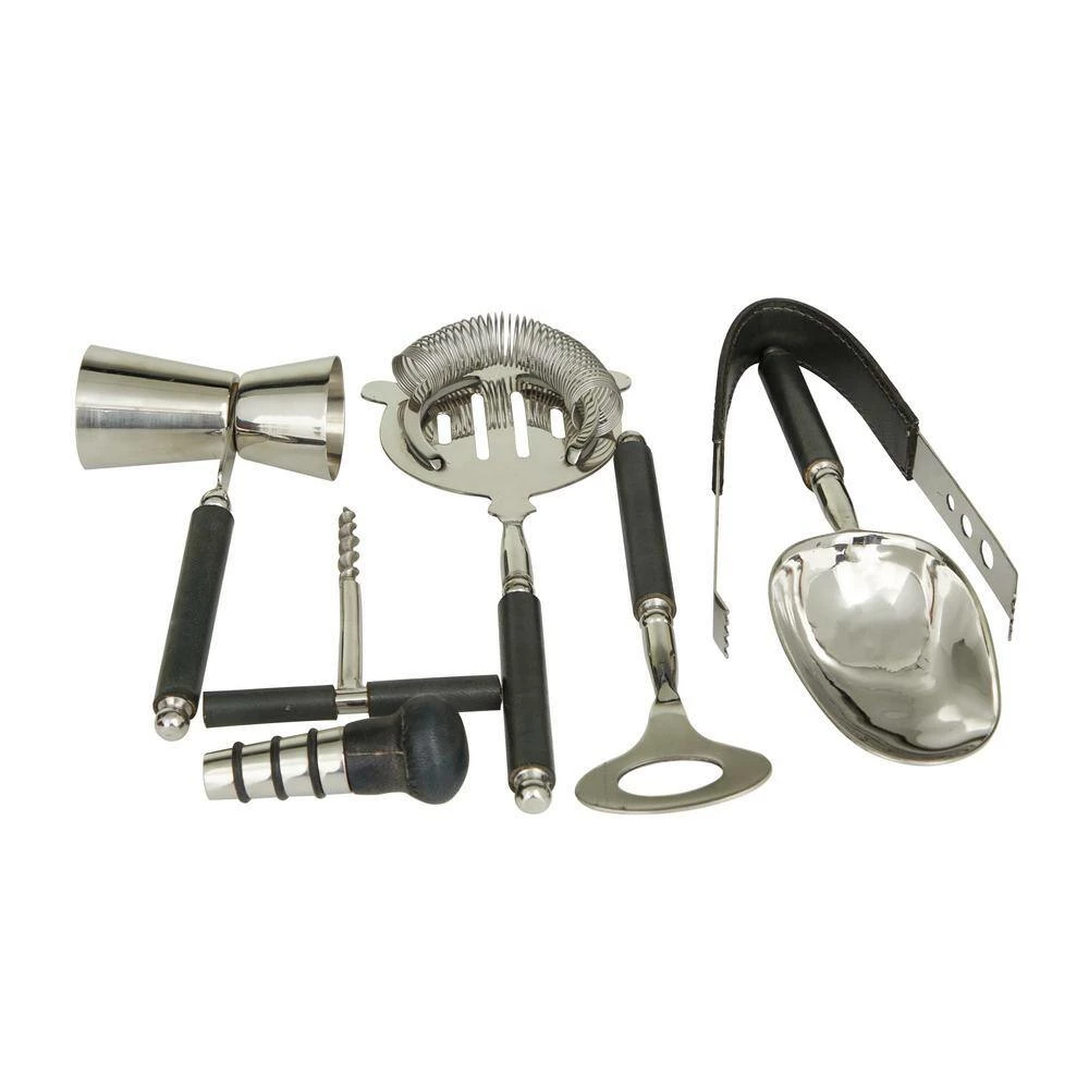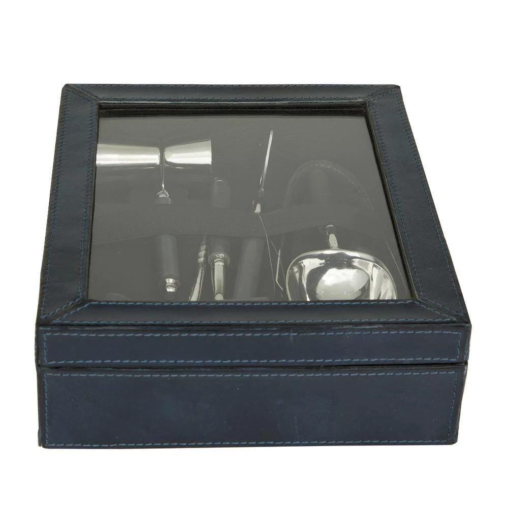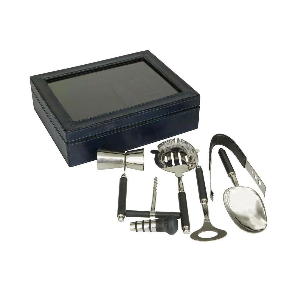Looks stylish in your living room or kitchen as a serving tool set or as a decorative display. This sleek and well crafted bar tool set features a luxurious polish in a protective robust box. Make the perfect mixed drink with this 7-piece navy rectangular leather toolbox that can make great cocktails or ideal decoration on any accent table. This item ships in 1 carton. Suitable for indoor use only. Leather and hair on hide are natural products, and therefore no two will be alike. There may slight variations in pattern, natural blemishes, colors, and overall aesthetic of the product. Holds up to pounds. Made in India. Modern Theme.