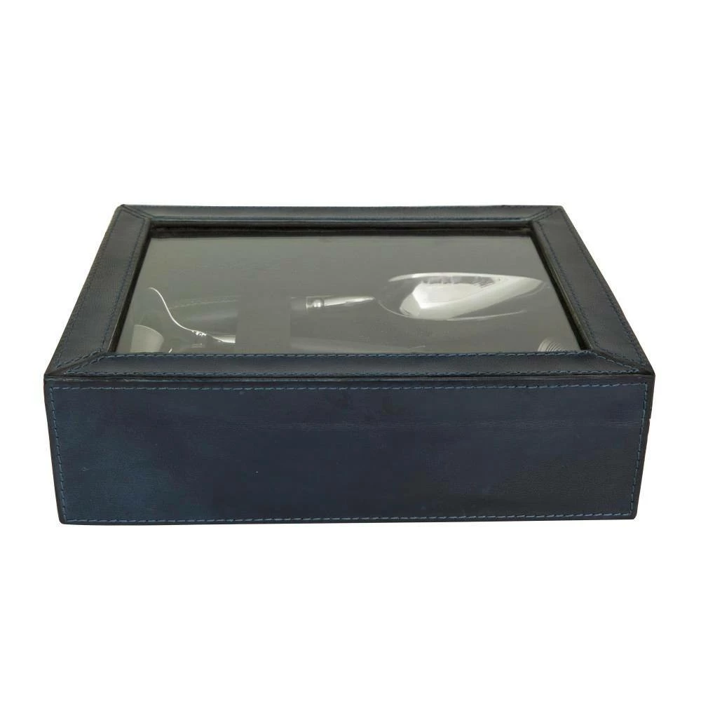 - A leather bar toolbox with a navy finish that suits various interior designs especially modern