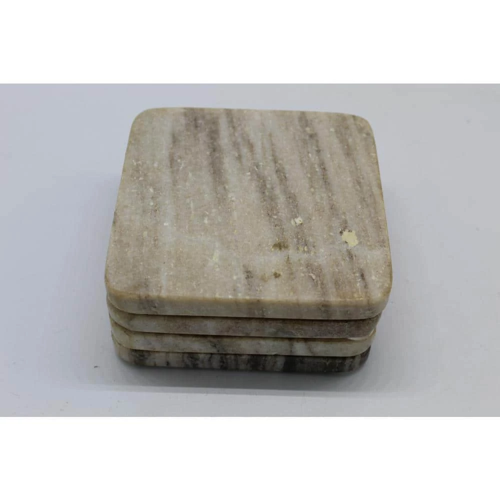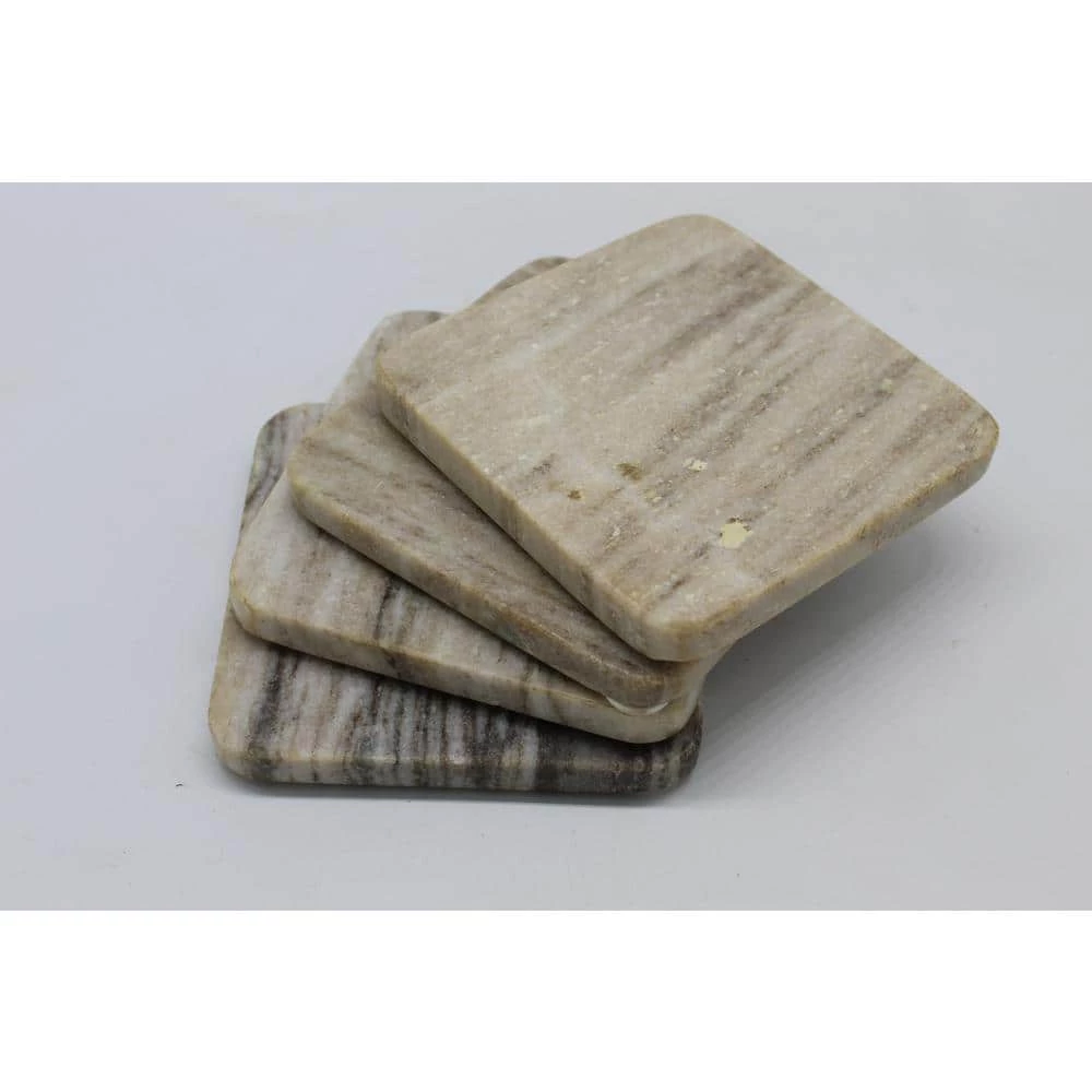 Jodhpuri 4-piece coaster set is made of solid natural marble. Marble keeps moisture, grease and odors from penetrating. Elegant design fits your contemporary modern home. Hand craft and polished from genuine natural marble, any color variation is its own uniqueness. This Set contains 4-coasters.