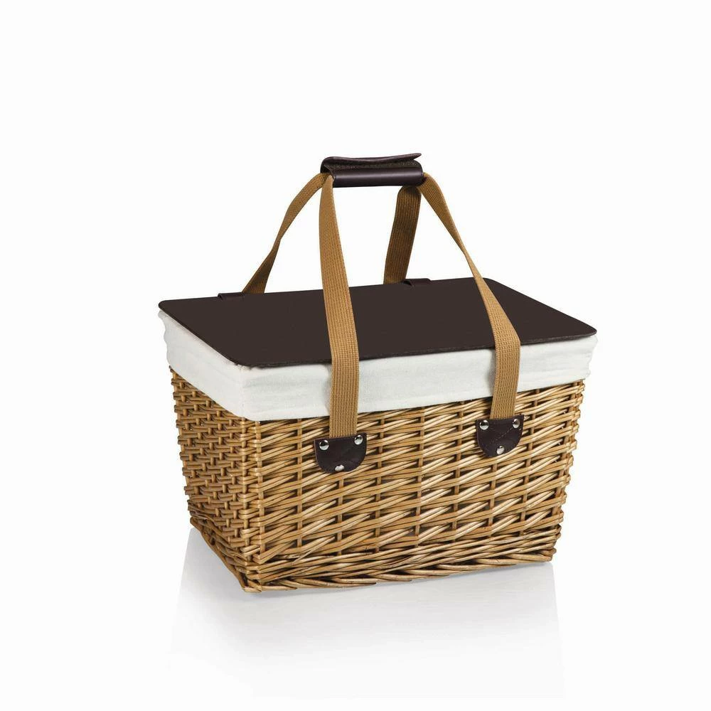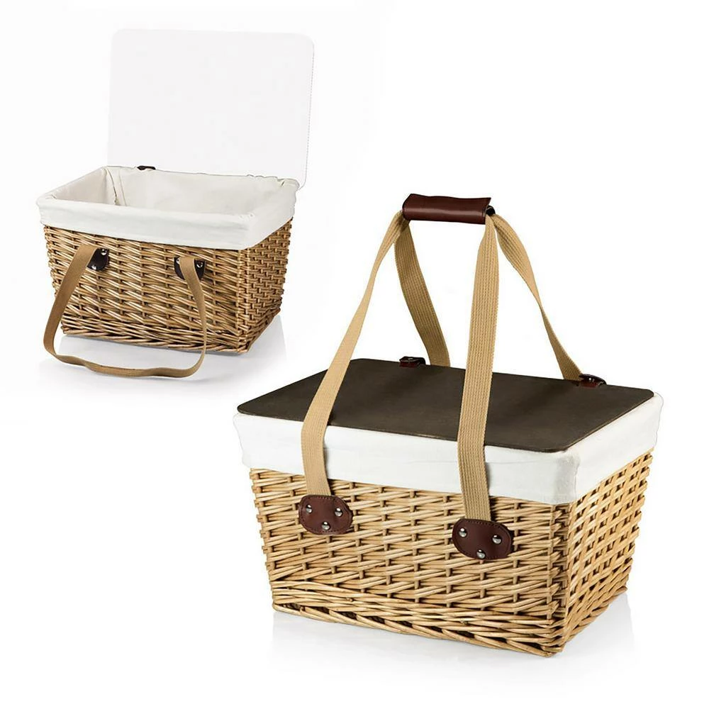 The Canasta is a flat-lidded empty picnic basket that is as versatile as it is charming. Its sturdy willow base has an attractive double-strand weave design, and its lid is made of a painted composite wood that can be used as a level surface to hold your drinks, plates or other items. The basket measures 16.5″ x 11.5″ x 10″ and is lined with a removable, form-fitted poly/cotton cover that folds over the rim and stays securely in place with two sets of tie straps. Two long cotton canvas straps can be secured together with a fastening handle for comfortable carrying. Discover the many ways you can enjoy the Canasta Basket!