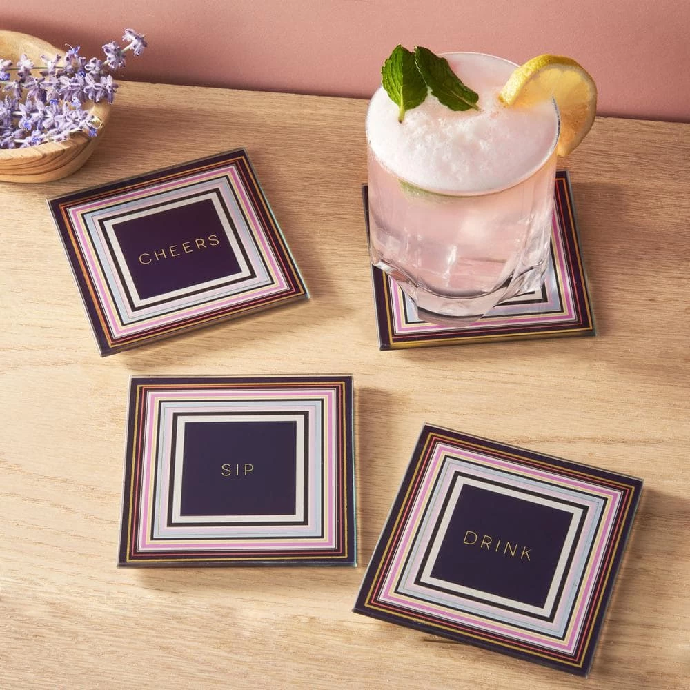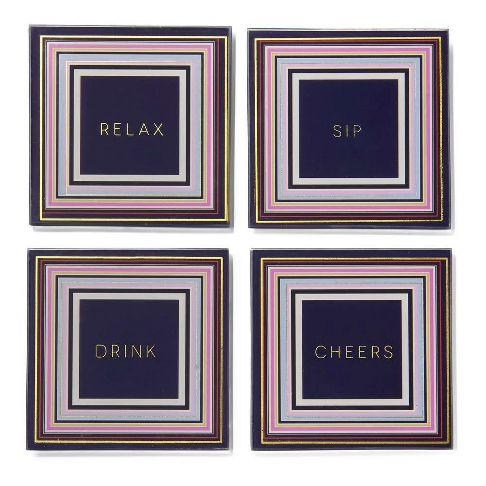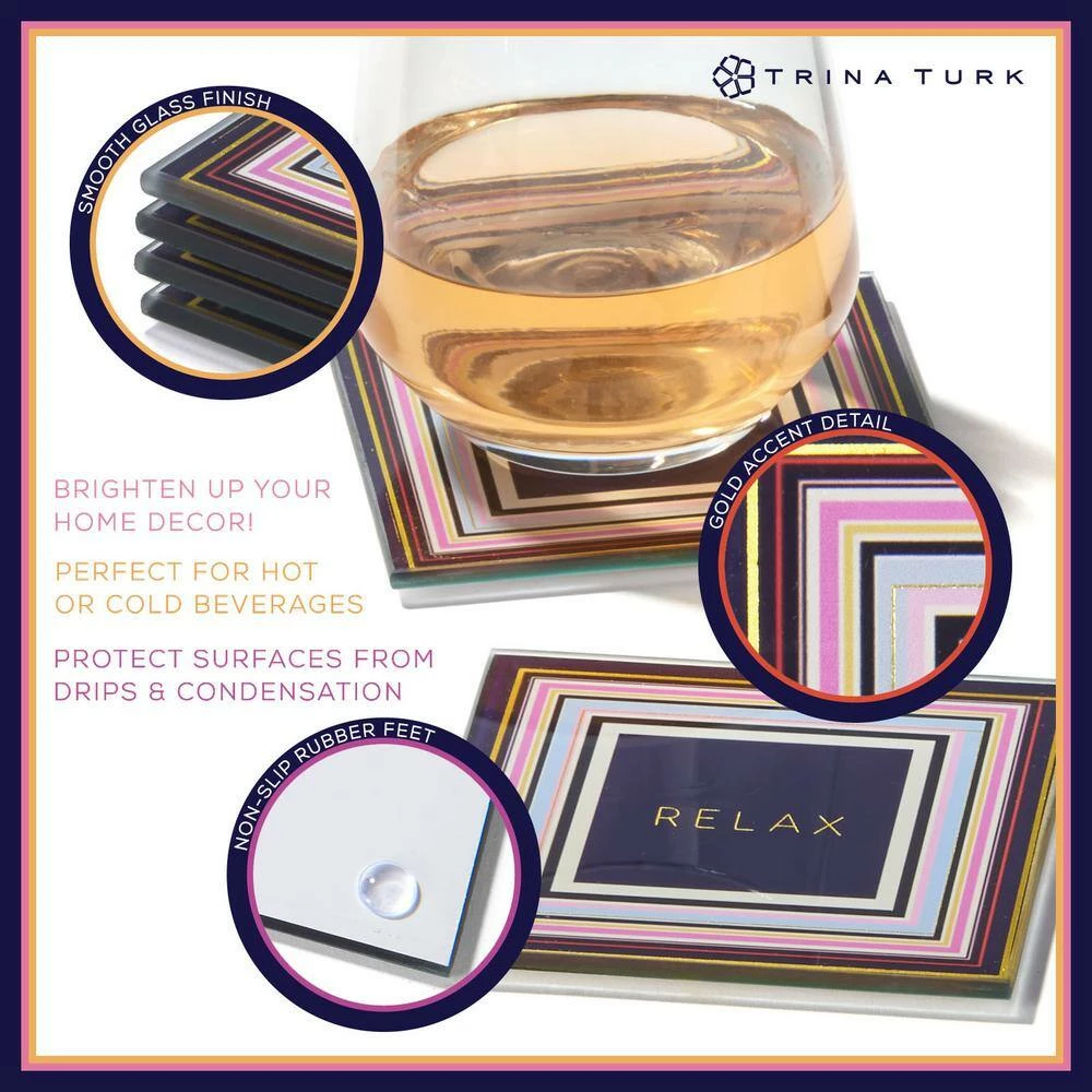 Avoid that awkward moment when guests place a glass dripping with water beads on your treasured coffee table, forcing you to run for a paper napkin. How? By keeping a set of stylish Drink Coasters from Trina Turk Cheers To You Gold Set Of 4 Glass Coaster Set 4″D handy! Versatile and functional, these beverage coasters prevent water rings from ruining your furniture and a social faux pas from marring your friendship.
