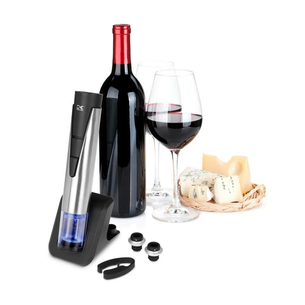 KALORIK’s 2-in-1 Wine Opener and Preserver makes enjoying and keeping your favorite bottles fresh and accessible, time and time again. High-tech, rechargeable, and cordless electrical opener and preserver is both functional and stylish with its brushed stainless steel housing and easy to use operation. Open bottles of all shapes and sizes. Cork is automatically removed and released in a matter of seconds. Vacuum seal partially consumed bottles, removing excess oxygen from within to avoid oxidation and keep your wine fresh. Just press down on the bottleneck to open up to 30 bottles and seal another 50 on an 8-10 hour charge. Blue indicator light lets you know when in use or charged and includes a charging base, foil cutter, and 2 wine stoppers; all of which conveniently stores in the base. A must have for the wine connoisseur.