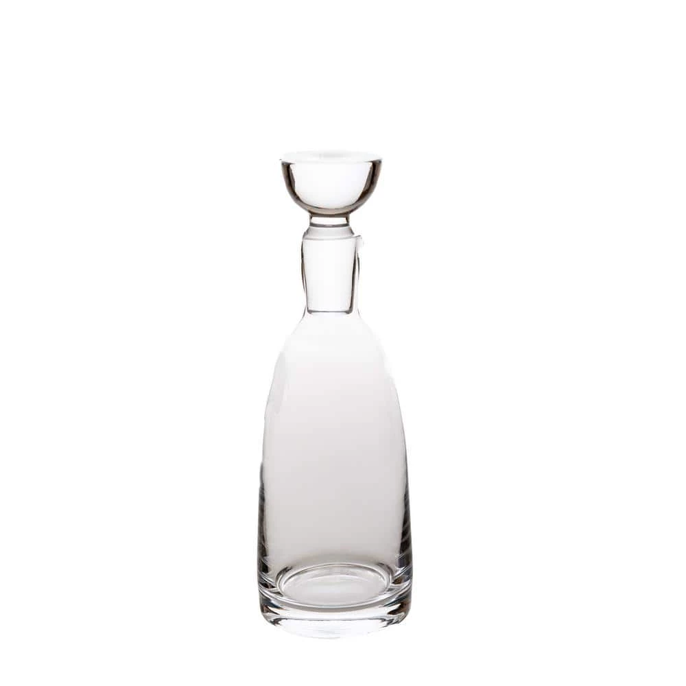This is a tall slim crystal decanter with a nice flat top stopper gives this decanter its style. It is great to add into a collection of decanters as it offers height to a grouping. This piece is made from lead free crystal.