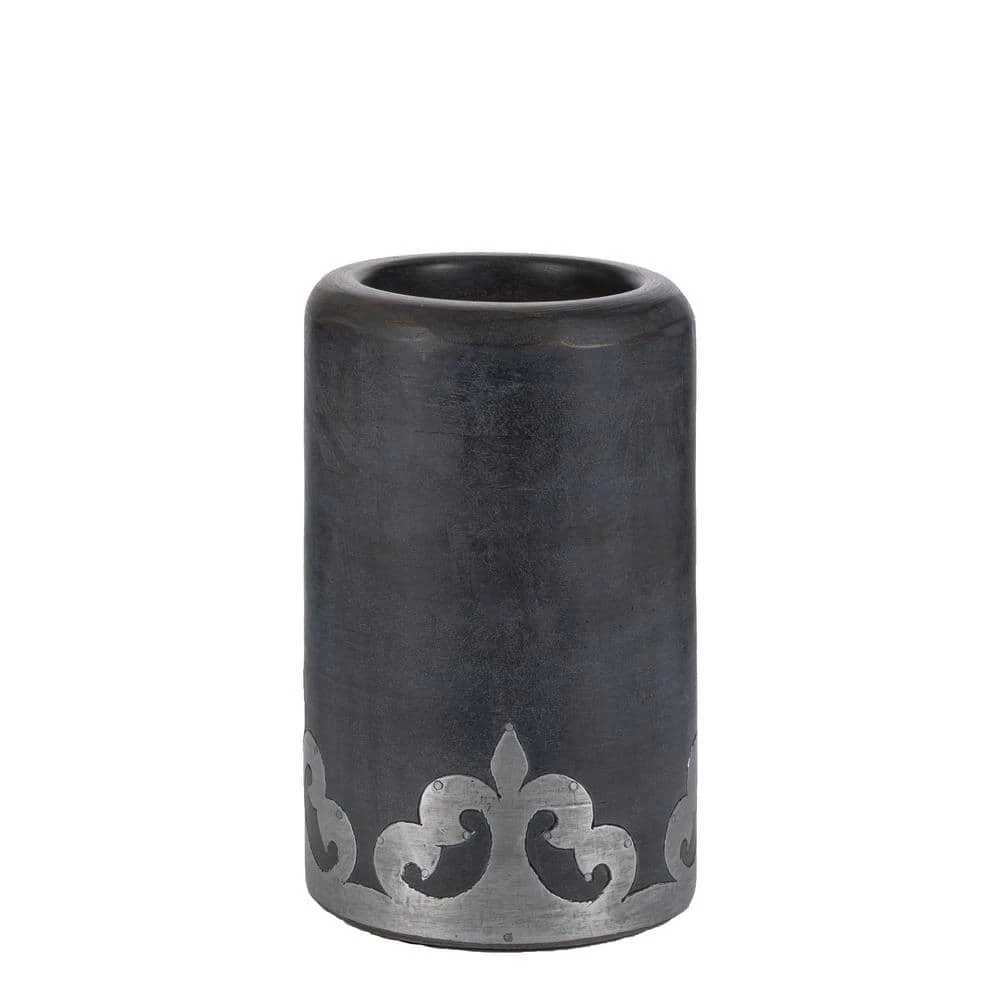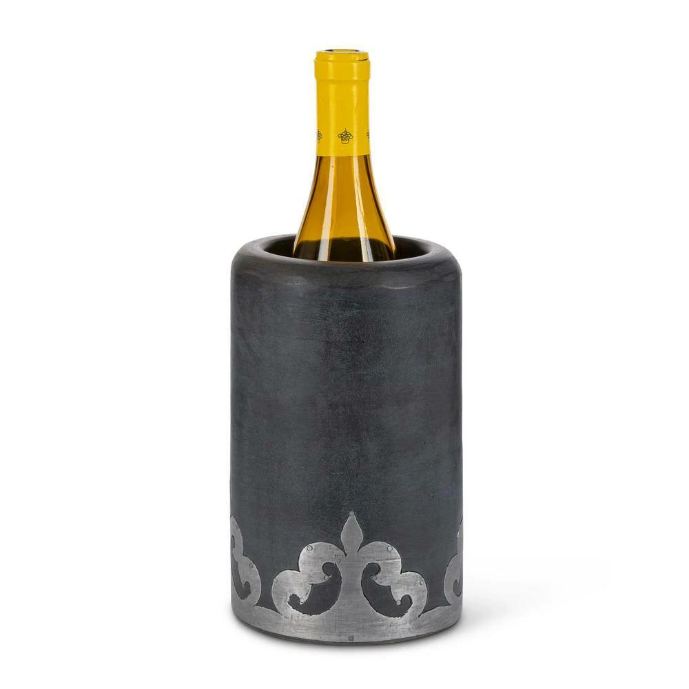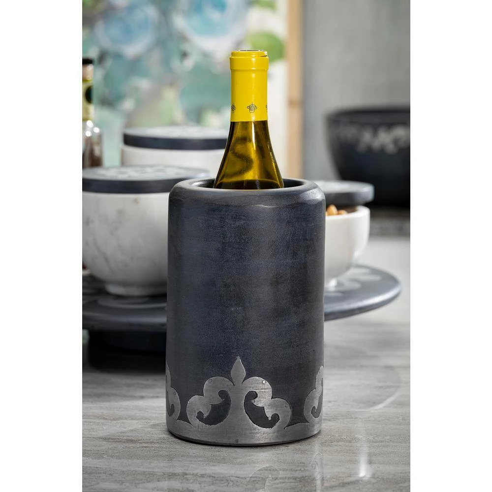 Our new metal-inlay collection is washed with a translucent stain to create beautiful dark gray tones that compliment all neutrals, woods and decors. Our wine chiller has a metal wall to help keep the chill, and makes a great utensil holder as well. Mango wood is used for its sustainable qualities.