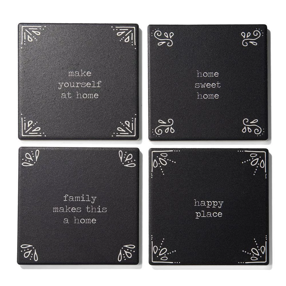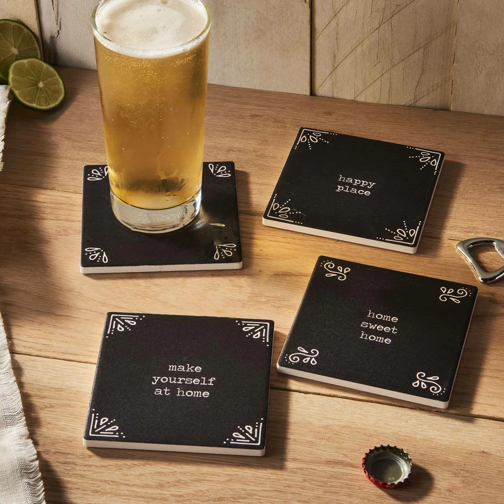 Avoid that awkward moment when guests place a glass dripping with water beads on your treasured coffee table, forcing you to run for a paper napkin. How? By keeping a set of stylish Drink Coasters from American Atelier Happy Place Set Of 4 Ceramic Coasters 4.25”D handy! Versatile and functional, these beverage coasters prevent water rings from ruining your furniture and a social faux pas from marring your friendship.
