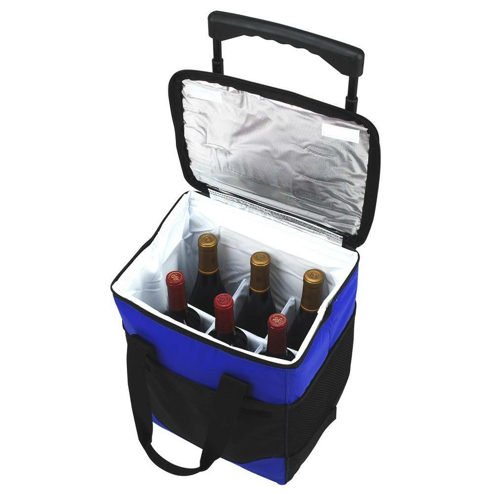 - Collapsible Insulated 6 bottle wine carrier with telescopic steel handle and easy glide wheels
