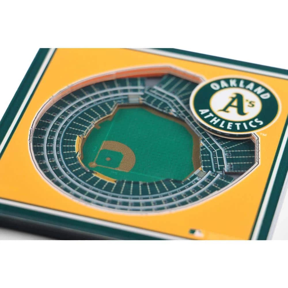 Score great seats for your glass. Introducing the Oakland Athletics StadiumViews 3D Drink Coasters. Theyre made up of multiple layers that form a 3D replica of your teams actual stadium – only a little bit smaller. The protective top layer is clear so you can get a great view of Oakland-Alameda County Coliseum. Great for living rooms, fan caves and sports bars anywhere. Looks great even when not in use and sure to be a conversation piece around any table.