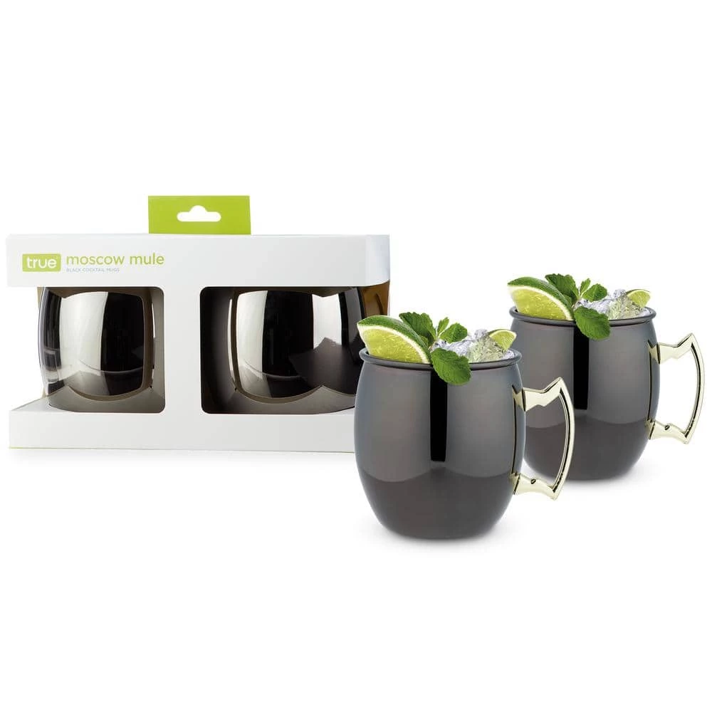 Double or nothing: This handsome pair offers a refreshing take on the Mule mug. Restaurant-grade stainless steel with a polished black exterior, completed with a golden-hued zig-zag handle come together to create the ultimate accessory for crafting elegant cocktails. Hang it up in the kitchen or fill it to the brim with the classic concoction of vodka, ginger, lime, and fresh mint. Set of 2 Holds 16 oz. Stainless steel Black and gold finish Hand wash recommended True makes entertaining simple and elegant with stylish, functional serveware, dishes, and entertaining accessories. Combining streamlined design with functional utility, True elevates the basics.