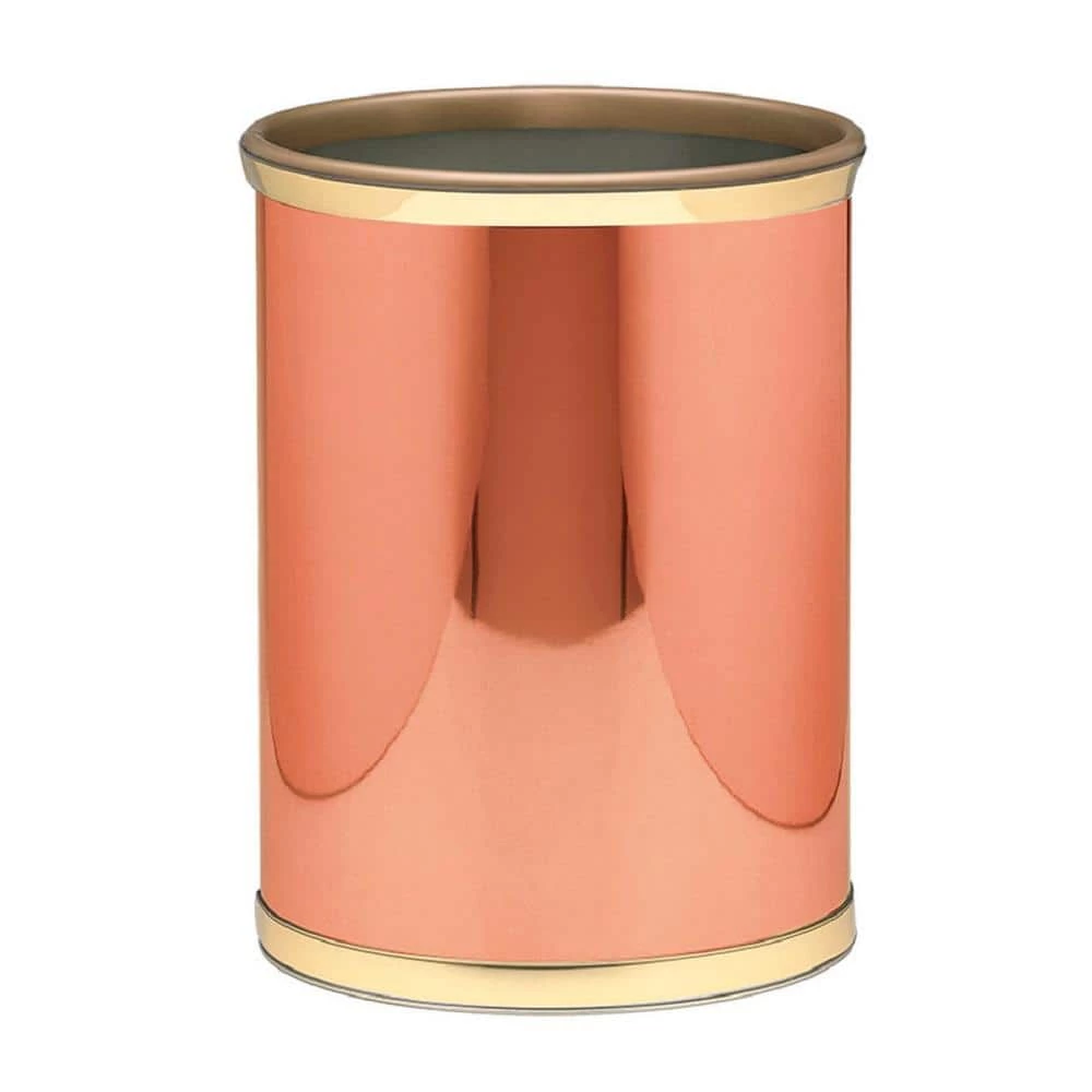 Kraftware Classics Mylar Collection offers high style in classic designs. Made of metal, this waste basket is wrapped in Mylar. This 13 Qt. Oval Waste Basket is offered in a beautiful polished copper finish with brass top and bottom accent bands.