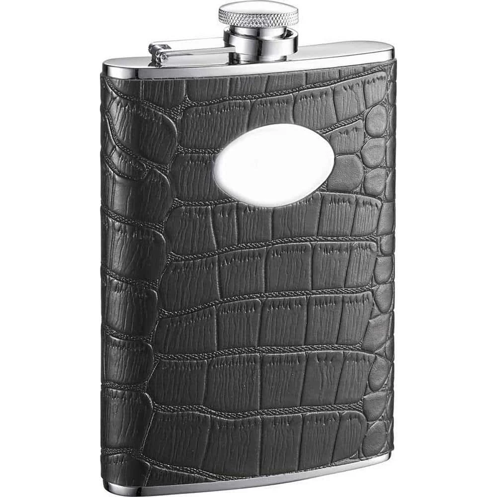 A strong stainless steel flask is the perfect place to keep your favorite drink while on the move. This flask will hold eight ounces of your favorite beverage so you can bring it along wherever you go. Genuine black leather surrounds the stainless steel frame for a dark and appealing look. The leather even has a crocodile texture you will love.