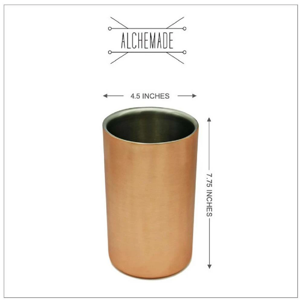 This stainless steel copper tabletop wine chiller is simple, yet striking. Measuring 8 in. High x 5 in. wide, this wine bucket chiller fits a bottle of champagne or wine perfectly. Add to your home bar for happy hours, parties or dinners. This is also a great wine chiller sleeve for weddings, events, catering, bars or restaurants. Designed as a champagne cooler bucket, it can also be used as an open ice bucket. This insulated metal cooler will keep your ice from melting and keep your bottles cold. It’s also perfect for everyday use. Great for bottles of water, juice, iced tea or your favorite beverage. It even makes a great kitchen utensil holder on your kitchen counter. Not only does it have many practical uses, it looks great and adds extra style to any meal or party. Get one for yourself and another for a family member or friend. Perfect for Christmas, holidays, house warming, thank you, weddings, birthdays, Mother’s day and more. Pair with any of our other copper barware for the complete entertaining package. This stainless steel copper bucket is made with quality materials and coated with a food-safe lacquer to resist tarnish and maintain its beauty and lustre for years to come. Please hand wash only using warm water and soft soap. Do not scrub. Not suitable for dishwasher or microwave use.