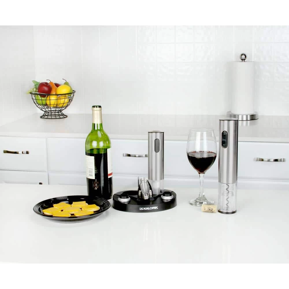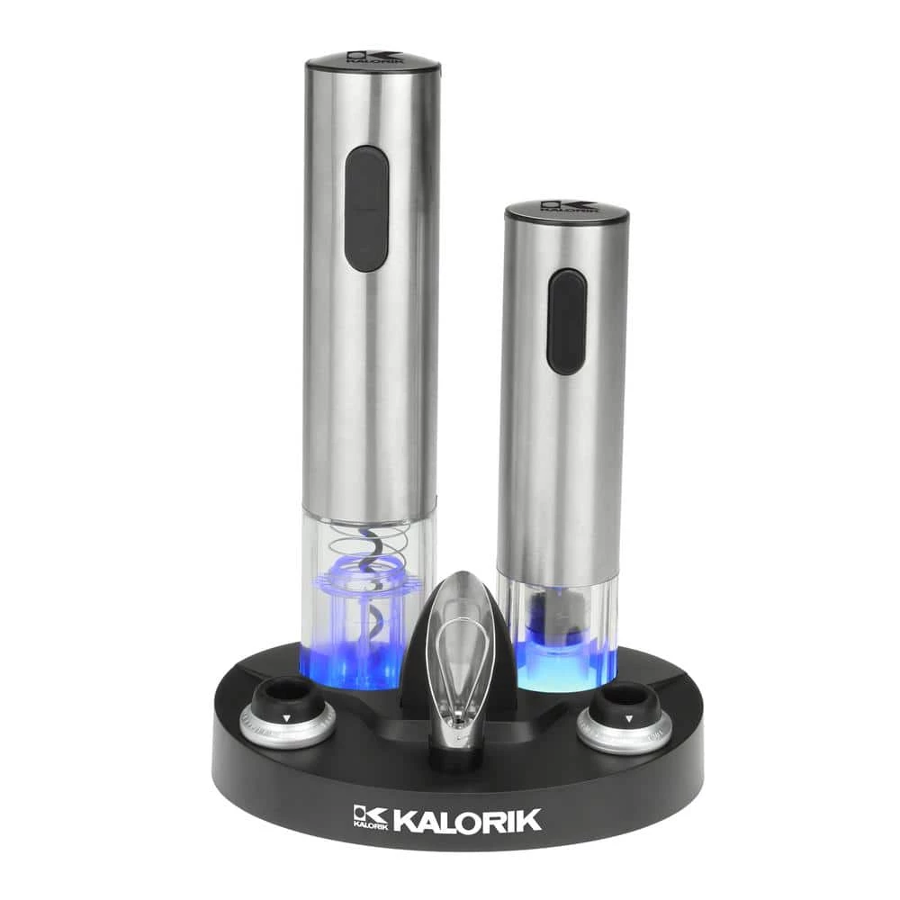 Make opening and storing wine a fun and exciting experience with the KALORIK Wine Opening Set. Easily uncork your wine bottles with the electric, stainless steel wine opener. Then, reseal them to avoid premature oxidation using the wine preserver. The set includes 2 rubber stoppers to use when resealing your bottles. Not only do these keep wine fresh, but you can also use the date rings to indicate when the bottle was opened. All accessories can be stored on the space-saving charging base. As the unit is charging, it illuminates with a bright blue LED light that will bring elegance and style to your kitchen.
