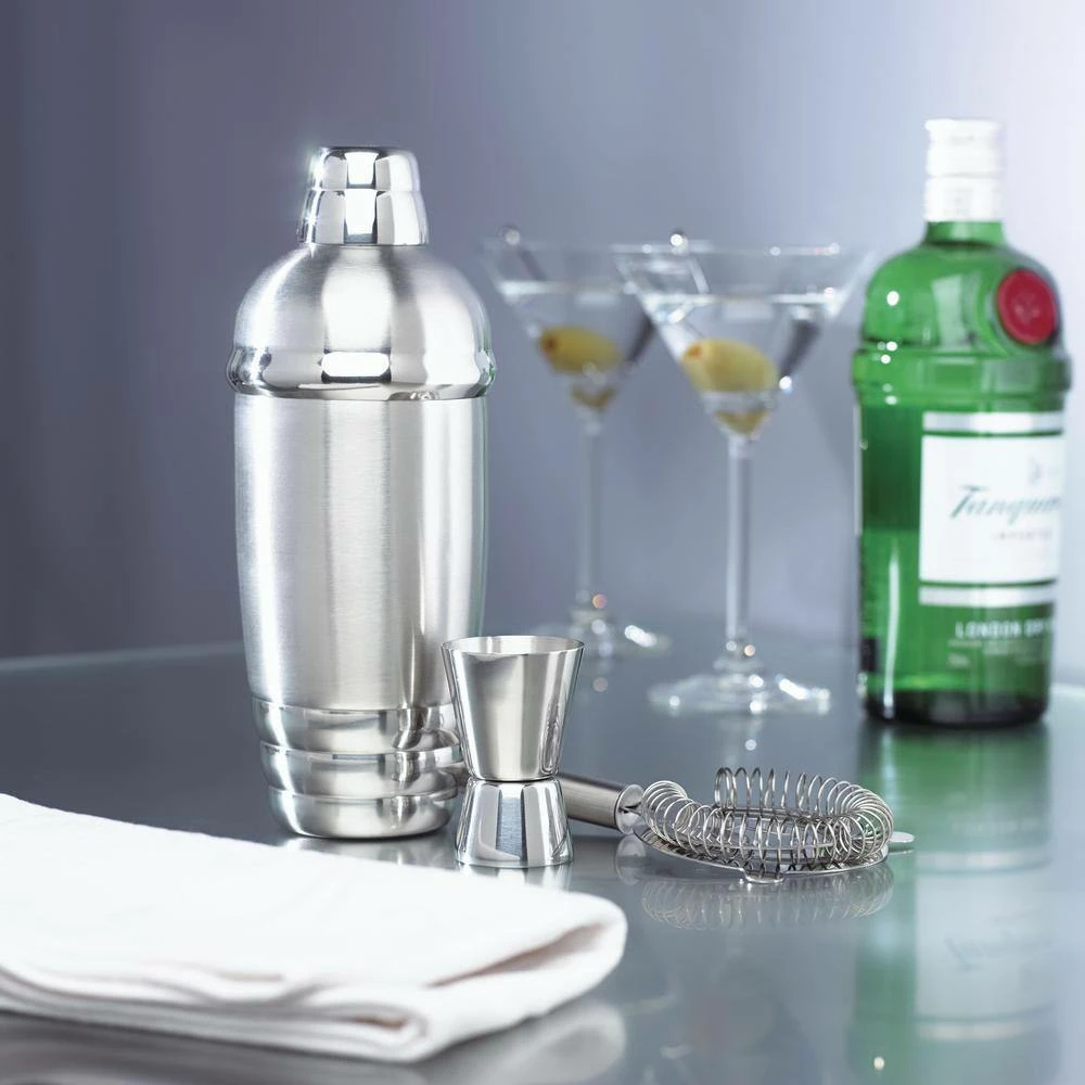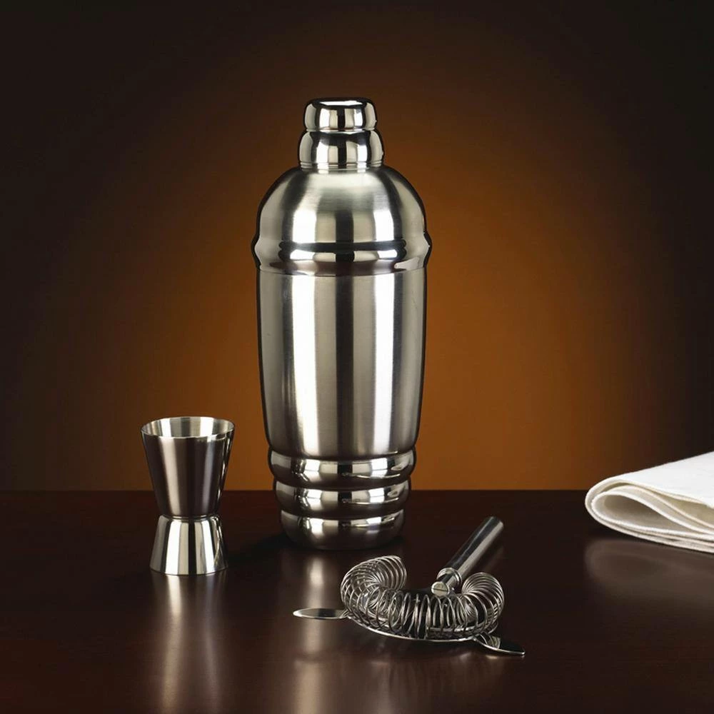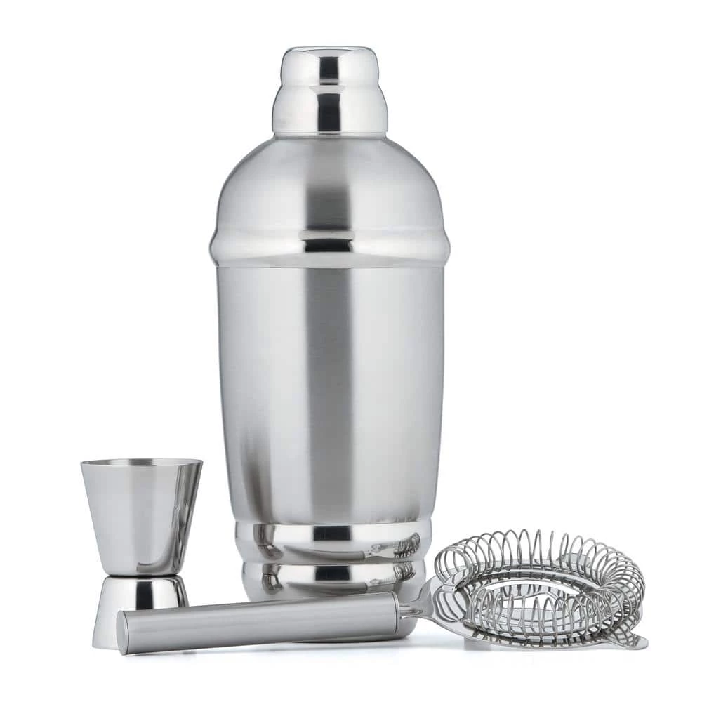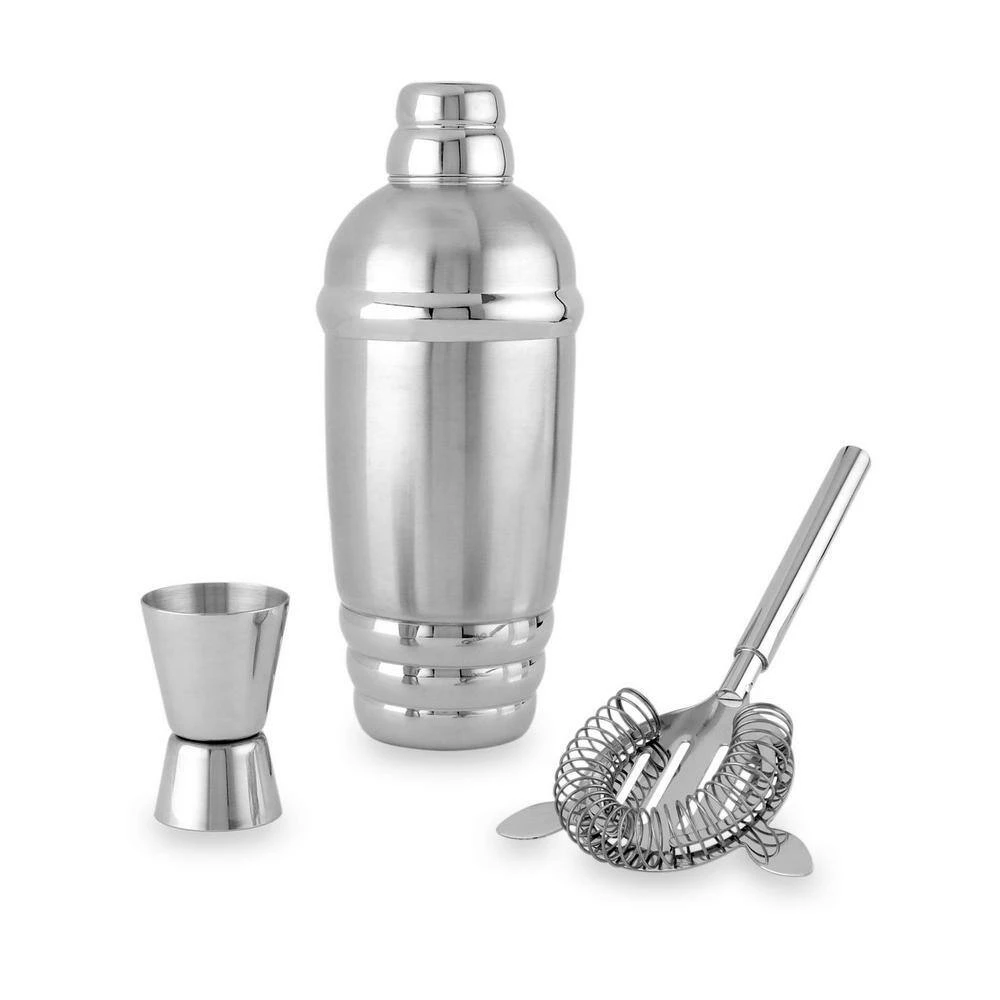 - Set includes: metal shaker, strainer and jigger
