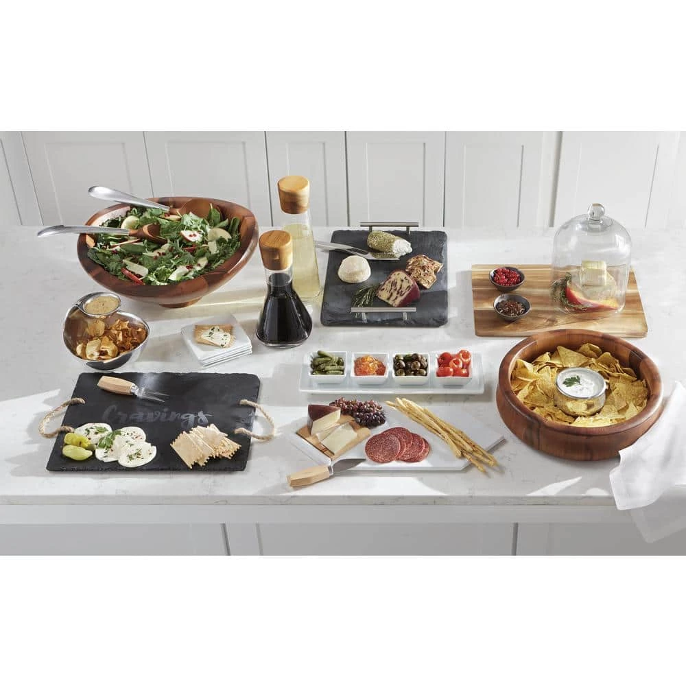 - Made of glass and acacia wood