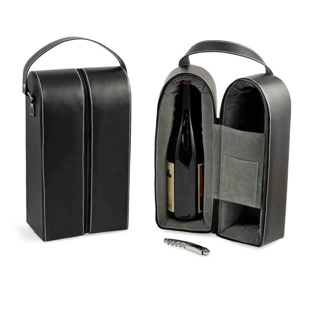 Black Leather Wine Caddy for Two Bottles and Bar Tool with Corkscrew, Bottle Cap Opener and Foil Cutter. Perfect for the weekend get away or just a night out with friends. Protective lining to ensure all your fine bottles of wine arrive safely.